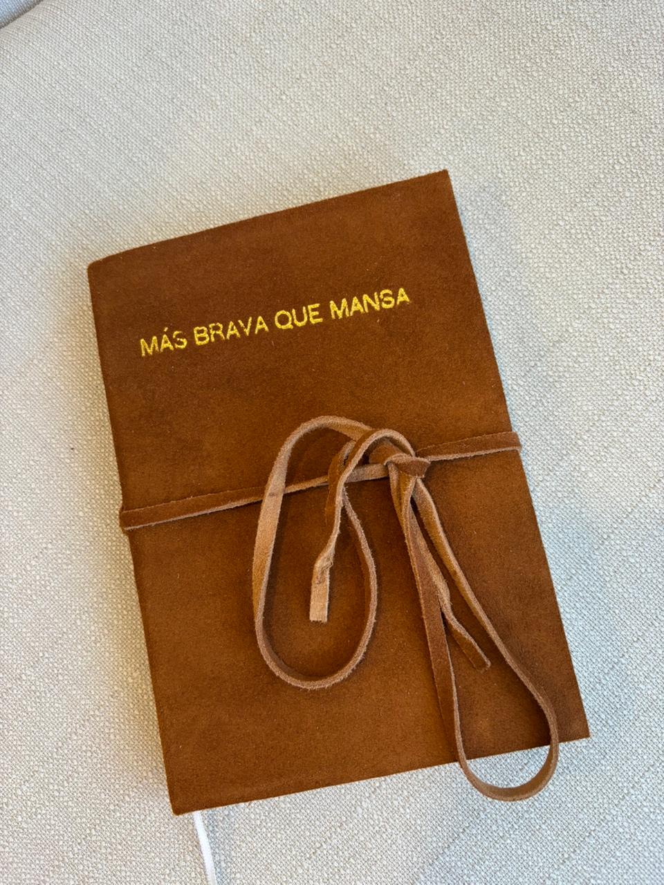 O caderno Más Brava que Mansa é feito à mão com uma elegante capa de camurça macia e um delicado laço, perfeito para adicionar um toque especial às suas anotações, esboços ou diários. Cada peça é confeccionada individualmente, podendo apresentar pequenas variações de tamanho, cor ou textura da camurça, garantindo que cada caderno seja tão exclusivo quanto suas ideias.